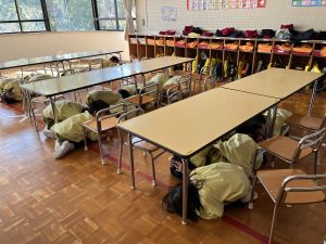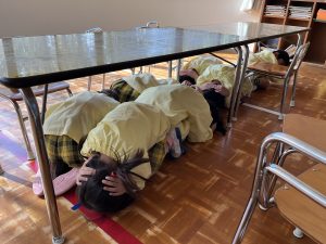 地震速報の音が流れると、机の下に潜りダンゴ虫ポーズをして頭を守る姿が見られました。