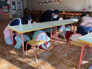 音にビックリして涙を流してしまう子もいましたが、教師の話しをしっかり聞き、最後は落ち着いて園庭まで避難をすることができました。
