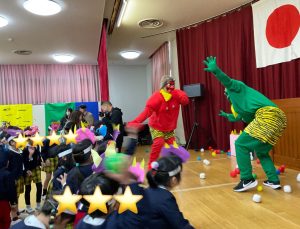 先生や友だちと一緒に豆(カラーボール)をまきながら、勇気を出して心の中の鬼を